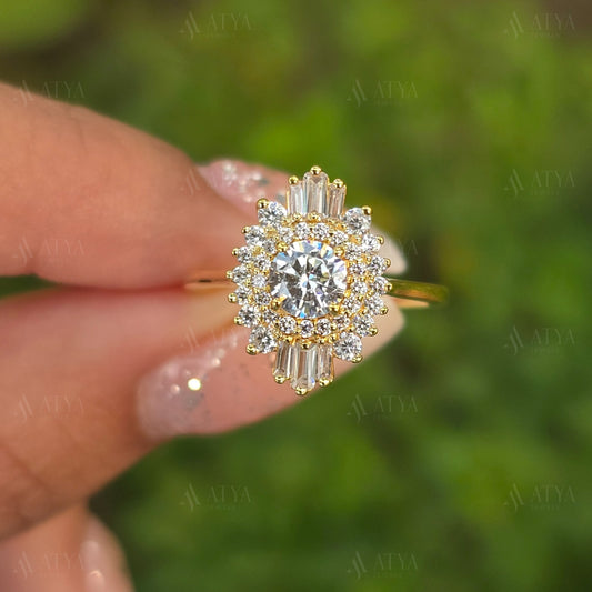 Unique Round Cut Starbust Moissanite Engagement Ring 14K Solid Gold Hidden Halo Promise Ring Side