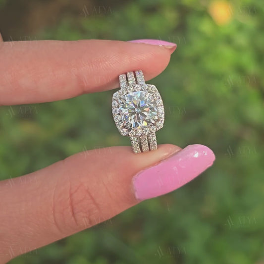 Moissanite bridal sets refer to a coordinated pair of rings designed to be worn together. Typically, these sets include an engagement ring and a matching wedding band. Both are crafted to complement each other in design and aesthetics, ensuring a seamless and stunning look on your big day (and beyond).