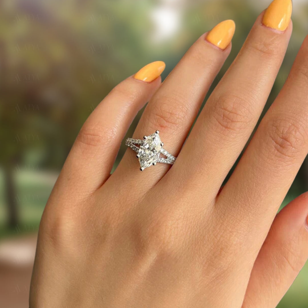 Celebrate your love story with the 2.00 CT Marquise Cut IGI Certified Lab Grown Diamond Split Shank Vintage Engagement Ring. The dazzling marquise-cut diamond, weighing 2.00 carats, is a stunning focal point, exuding brilliance and sophistication. Its split shank design enhances the vintage aesthetic, offering an intricate and timeless appeal. Perfect for brides-to-be who appreciate the charm of classic designs with a modern twist, this ring is a showstopper.