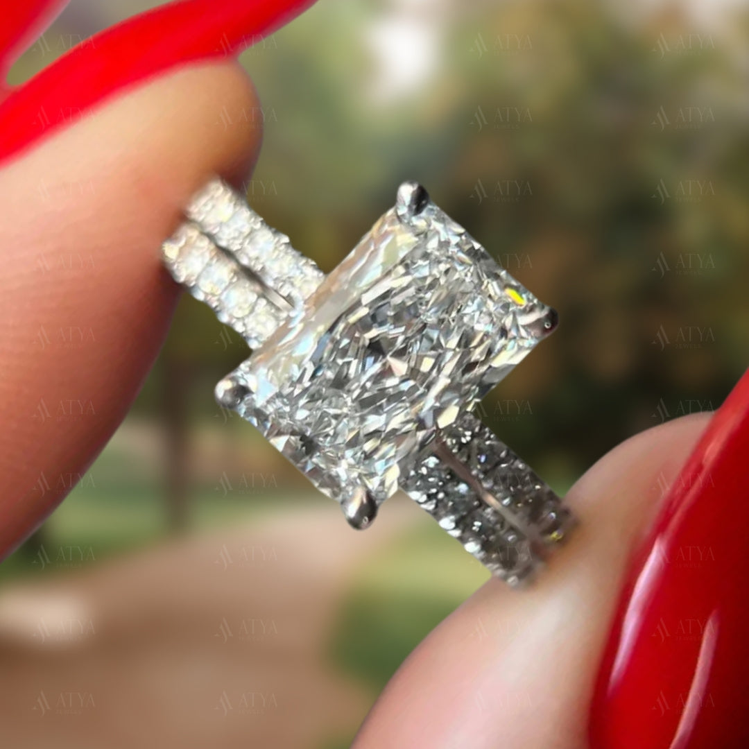 The 2.50 CT Radiant Cut IGI Certified Lab Grown Diamond Hidden Halo Bridal Ring Set is the epitome of elegance and modern design. The centerpiece is a stunning 2.50-carat radiant cut diamond, showcasing exceptional brilliance and fire. Enhanced by a hidden halo and a matching wedding ring, this set is a breathtaking symbol of your eternal commitment.