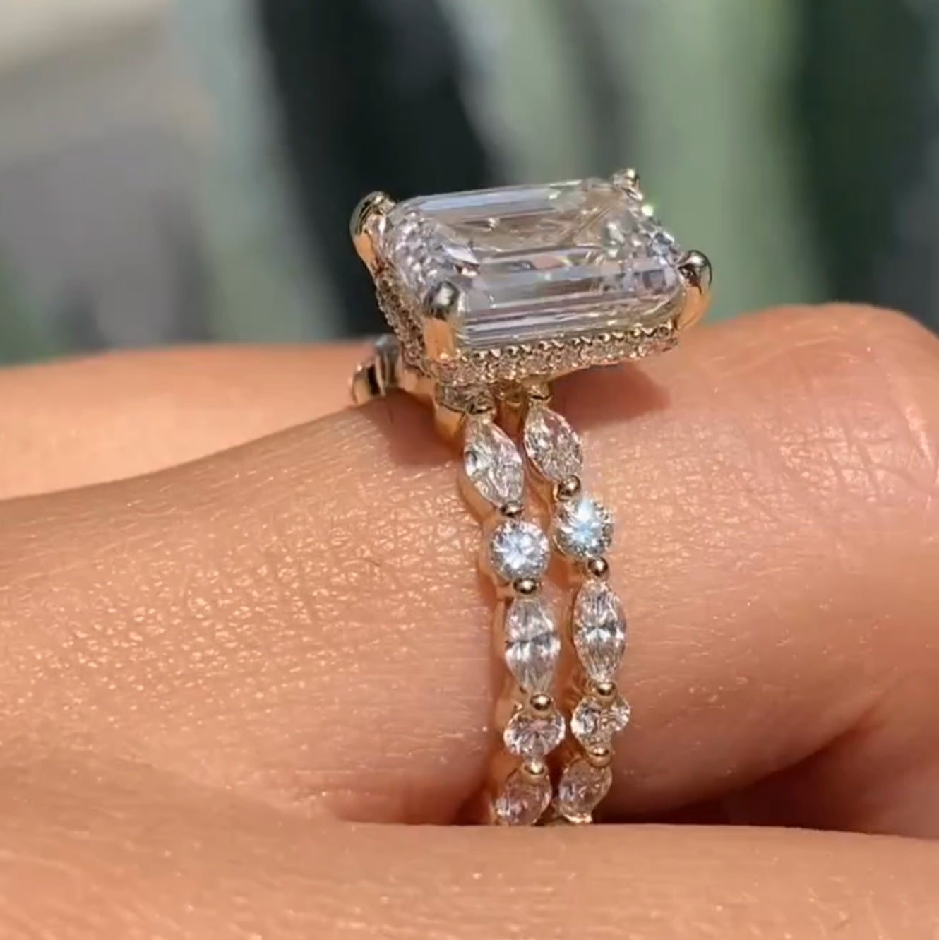 The 3.50 CT Emerald Cut Hidden Halo Moissanite Engagement Bridal Ring Set is a masterpiece of brilliance and sophistication. The centerpiece is a dazzling 3.50-carat emerald-cut moissanite, known for its sleek facets and extraordinary clarity. Paired with a hidden halo of sparkling moissanite accents, this ring set offers an understated elegance that captures attention and hearts alike.