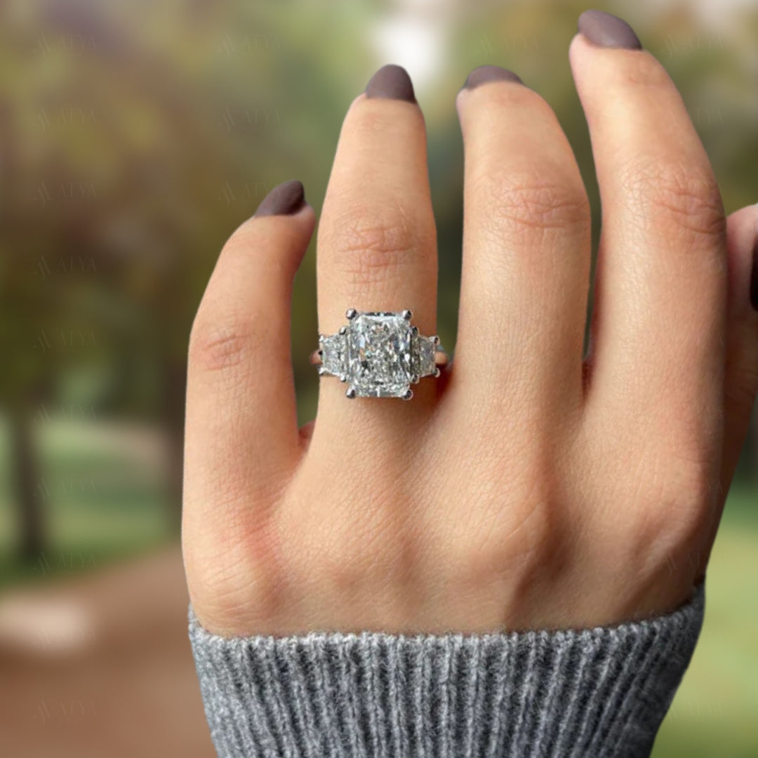 3.50 CT Radiant Cut IGI Certified Lab Grown Diamond Three Stone Engagement Ring Side Trapezoids Diamond Ring