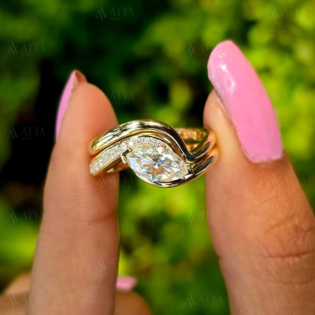 East-West Marquise Cut Moissanite Bridal Ring Set Unique Side Halo Design Wedding Ring Set