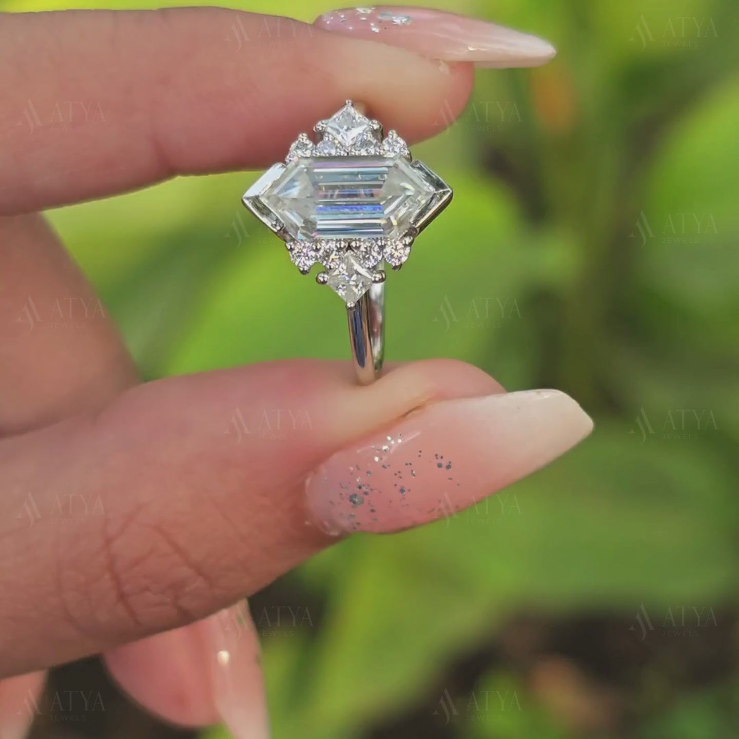 Elongated Hexagon Cut Moissanite Engagement Ring Unique Bridal Ring Anniversary Gift Proposal Ring