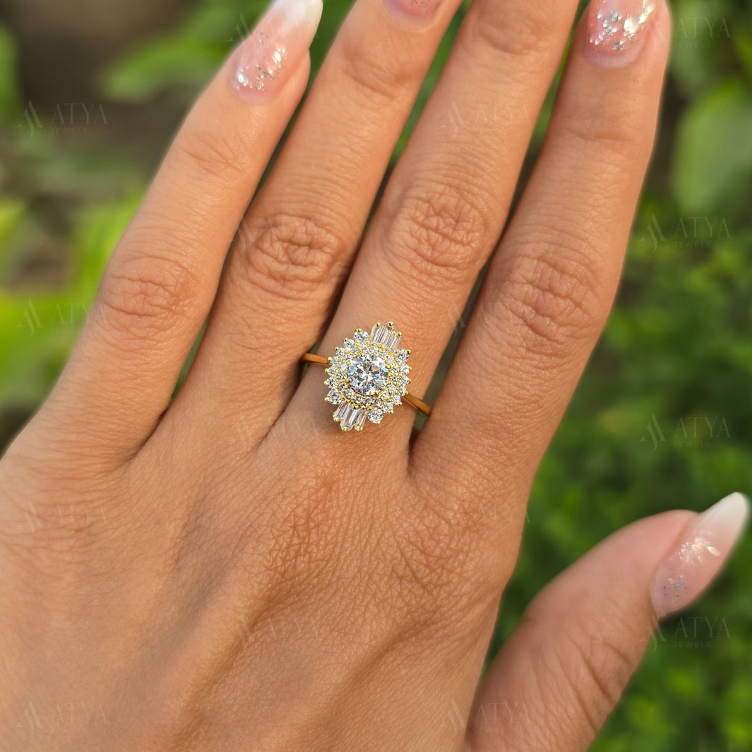 Unique Round Cut Starbust Moissanite Engagement Ring 14K Solid Gold Hidden Halo Promise Ring Side